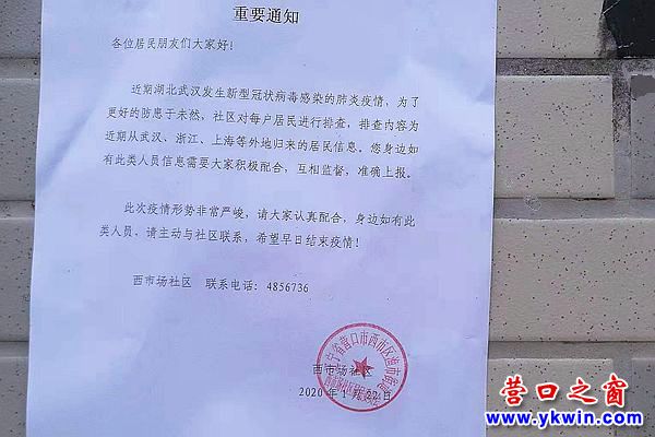 春節(jié)來臨,營口市各社區(qū)對目前新型肺炎疫情防控工作高度重視,對疫情制定專門應(yīng)急預(yù)案,做到早發(fā)現(xiàn)、早排查、早診斷、早治療。昨天,西市場社區(qū)特下發(fā)通知,如下: