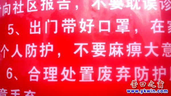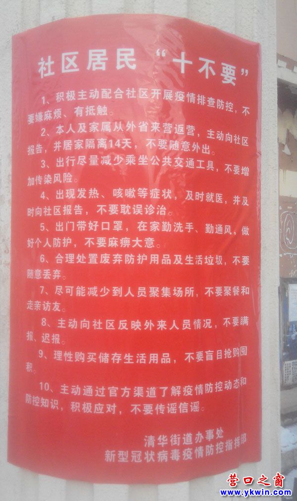 3月4日,來到營口市通惠門市場(chǎng)轉(zhuǎn)了一圈,發(fā)現(xiàn)其附近的數(shù)十家門市房的門玻璃上多數(shù)都貼著“未帶口罩 禁止進(jìn)店”的告示。其數(shù)量之多都到了泛濫成災(zāi)的地步。另外,營口市通惠門市場(chǎng)西鄰芙蓉園小區(qū)大門柱子上貼的《社區(qū)居民“十不要”》中也出現(xiàn)了“出門帶好口罩”的字樣。