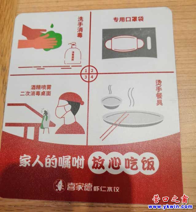 李女士與老伴晚餐時間,進入營口市萬達廣場內的一家“喜家德餃子店”。門前提供了免洗消毒洗手液,進入店內剛要坐下服務員又給每人送來了特制的透明塑料袋?原來是在吃飯時用于收藏口罩的。坐下后,又看到了餐桌上貼著“家人的囑咐”。吃完飯剛要出門,服務員又送來了擦手濕紙巾。一連串的行為讓兩位老人感動了,于是聽說營口之窗網專門給老百姓說事就來了。