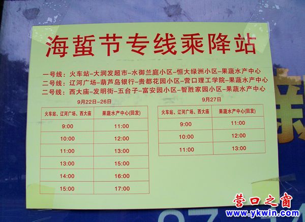 (營口之窗一事一議 胡 然)9月22日9時左右,好幾個營口市民在遼河廣場正南張貼《海蜇節(jié)專線乘降站》的公交車站候車,準備乘海蜇節(jié)專線去果蔬水產(chǎn)中心參觀采購商品。然而一直等到9:30分海蜇節(jié)專線的專車也沒來。