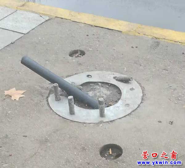 在營(yíng)口市立交橋向西百米處右側(cè)人行道上,有一線桿兩年前已被拆除,而留下了幾個(gè)裸露的地角螺絲還一直保留著。