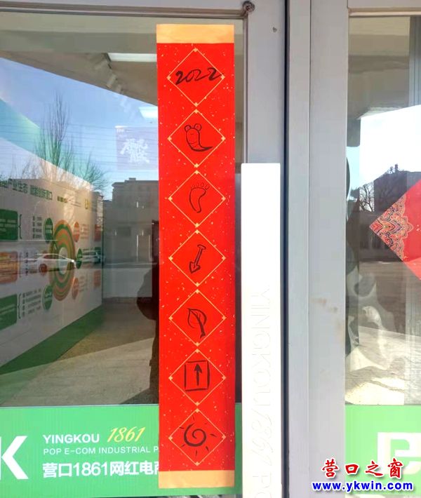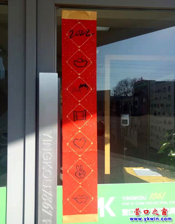 (營(yíng)口之窗網(wǎng)“一事一議”)1月30日,營(yíng)口1861網(wǎng)紅電商產(chǎn)業(yè)園的大門(mén)上貼出了一幅與眾不同的春聯(lián),即上下聯(lián)的內(nèi)容不是文字,而是圖形,如元寶、樹(shù)葉、心和腳印等(見(jiàn)下圖)。如何解讀這幅春聯(lián)那就要網(wǎng)友們發(fā)揮想象力了。