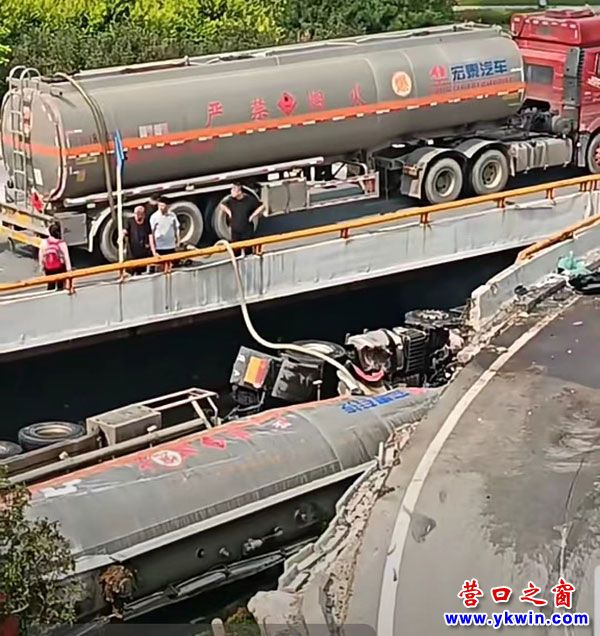 據(jù)了解,8月17日上午,一輛滿載柴油的油罐車在營口立交橋通往老邊的橋段不慎沖破護欄墜落約5米的橋下側翻,造成部分柴油泄漏。事故發(fā)生后,相關部門展開了緊急施救。