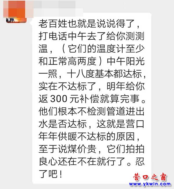 (營口之窗“焦點網(wǎng)談”)一段時間以來,營口市供暖溫度成為了市民的焦點話題,眾多老百姓對于熱電供暖出現(xiàn)的問題提出了質(zhì)疑且表示不滿,但室內(nèi)溫度低的問題遲遲得不到解決。很多市民在問:營口市供暖問題到底歸誰管、熱電供暖企業(yè)究竟想怎么辦、官方相關(guān)部門及領(lǐng)導(dǎo)怎么看,如何才能徹底解決?