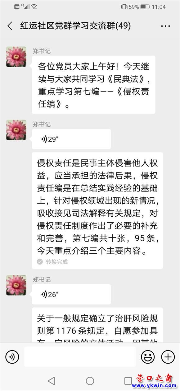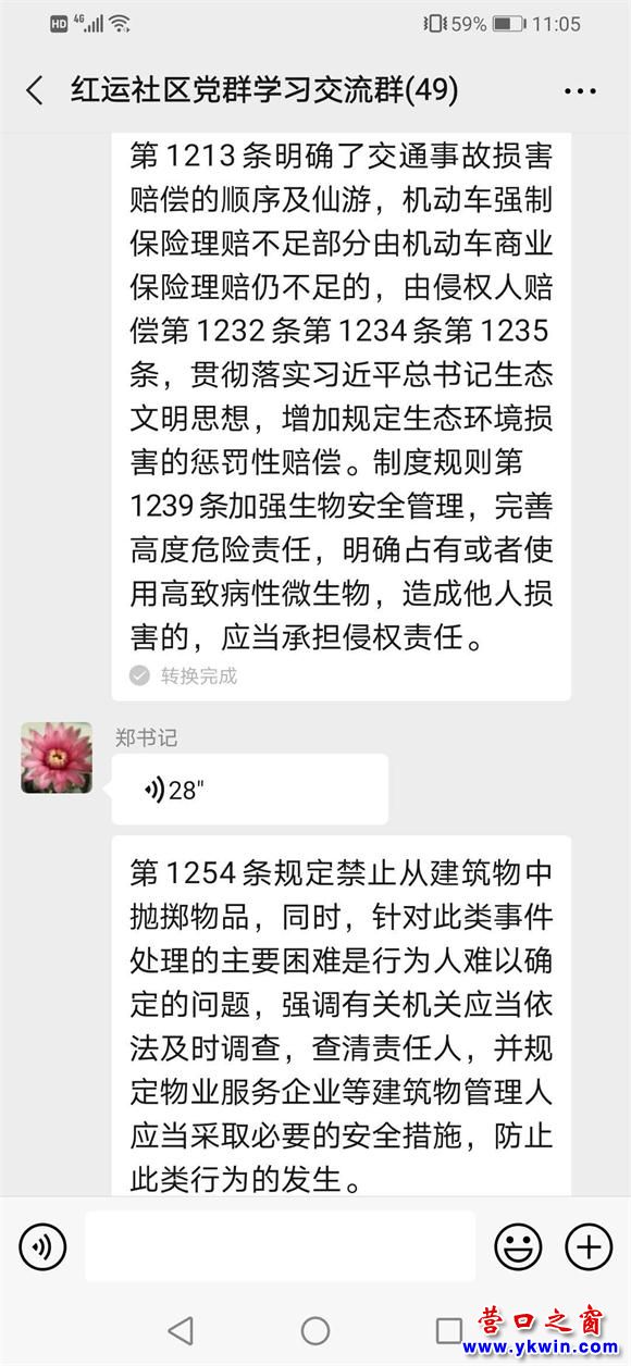 7月17日,社區(qū)再一次進(jìn)行“線上”開(kāi)展學(xué)習(xí)《中華人民共和國(guó)民法典》網(wǎng)絡(luò)宣講活動(dòng),以在黨群微信群中發(fā)送語(yǔ)音的形式進(jìn)行宣講。