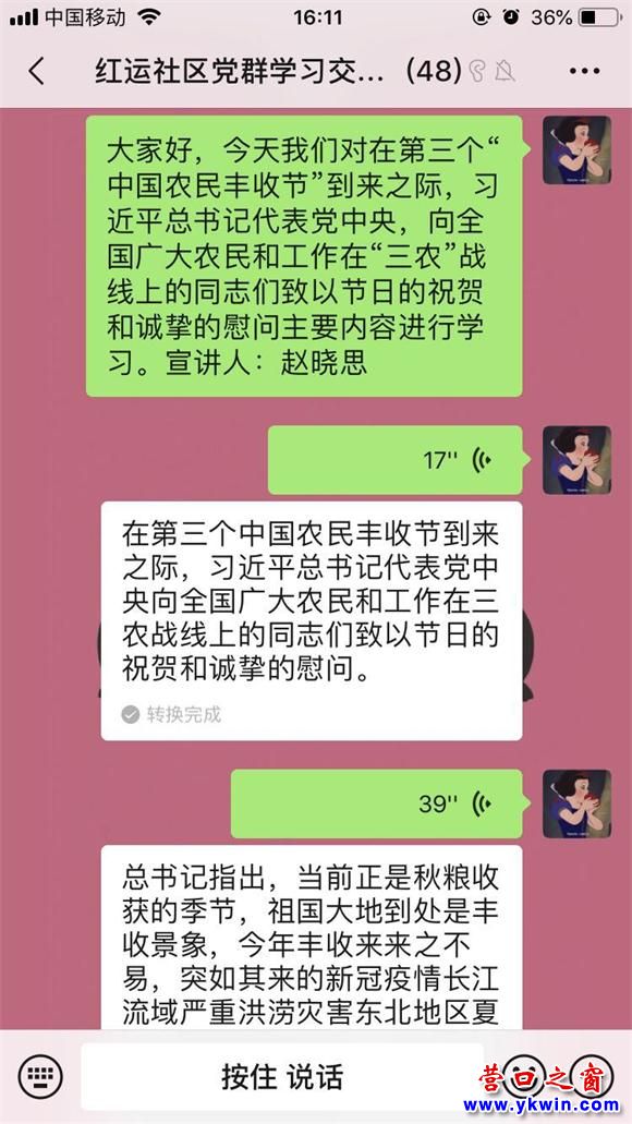 為進(jìn)一步開展“大喇叭”主題宣講活動(dòng),社區(qū) “線上”對(duì)在第三個(gè)“中國農(nóng)民豐收節(jié)”到來之際,習(xí)近平總書記代表黨中央,向全國廣大農(nóng)民和工作在“三農(nóng)”戰(zhàn)線上的同志們致以節(jié)日的祝賀和誠摯的慰問進(jìn)行了宣讀。