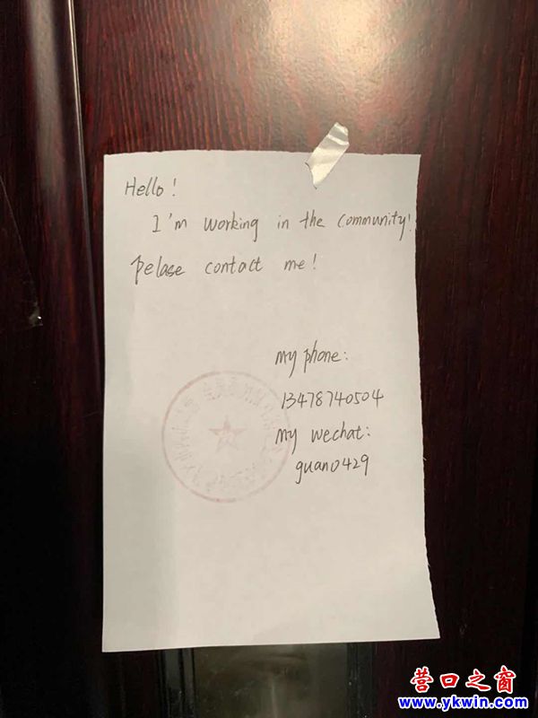 普查員小姐姐一如既往準(zhǔn)備敲居民家的門時(shí),旁邊熱心的鄰居告訴小姐姐:“這家住著一個(gè)外國人,平時(shí)白天上班,晚上才能回來。”“那您有他的聯(lián)系方式嗎?”“哎呀!我沒有,我老伴兒有。”“那我給他留言吧!您如果晚上看見他回家,幫忙提醒他聯(lián)系我,謝謝您!”就這樣,普查員小姐姐在留言條的背面寫下了一串英文,等待著與“歪果仁”的相遇。沒想到不一會兒外國小哥哥就主動(dòng)添加了普查員小姐姐的微信。