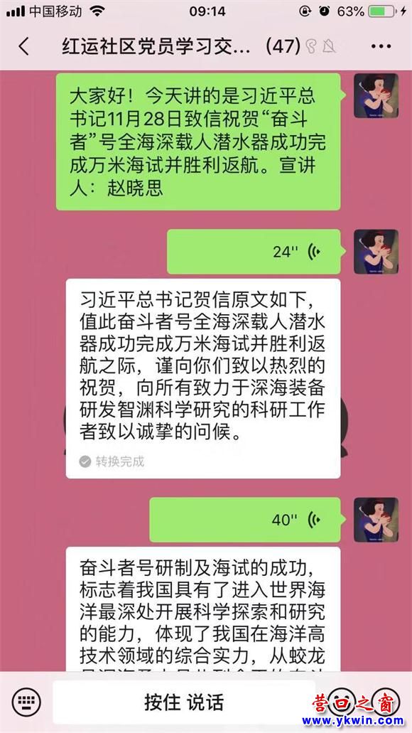 為進一步開展“大喇叭”主題宣講活動,社區(qū) “線上” 宣讀了習(xí)近平總書記11月28日致信祝賀“奮斗者”號全海深載人潛水器成功完成萬米海試并勝利返航。