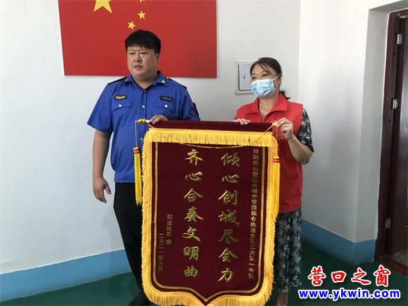 (營(yíng)口之窗社區(qū)訊)“感謝營(yíng)口市城市管理綜合執(zhí)法支隊(duì)二大隊(duì)一中隊(duì)在創(chuàng)城期間的辛苦付出,為居民辦了不少實(shí)事。”9月6日上午,紅運(yùn)社區(qū)黨委書記鄭金令,黨委副書記張立華,居民代表將寫有“傾心城市盡全力 齊心合奏文明曲”以及“盡職執(zhí)法助創(chuàng)城 為民服務(wù)美環(huán)境”的兩面錦旗送到了營(yíng)口市城市管理綜合執(zhí)法支隊(duì)手中,感謝營(yíng)口市城市管理綜合執(zhí)法支隊(duì)二大隊(duì)一支隊(duì)在創(chuàng)建全國(guó)文明城市工作中對(duì)社區(qū)的大力支持。
