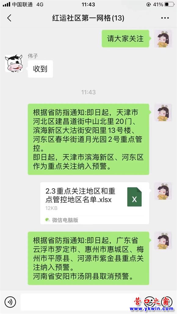 社區(qū)工作者及網(wǎng)格員在微信群組里定時(shí)更新重點(diǎn)管控地區(qū)及防疫知識(shí),“線上”提醒居民如有外來返營(yíng)人員應(yīng)及時(shí)報(bào)備。