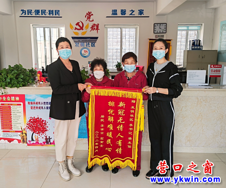(營(yíng)口之窗社區(qū)訊)4月21日,發(fā)明社區(qū)再一次收到了錦旗,來(lái)自同心南里小區(qū)的李女士和左女士將一面印有“新冠無(wú)情人有情 排憂解難暖民心”的錦旗送給了李書(shū)記和梁主任,以此表達(dá)對(duì)她們?cè)谝咔榉揽仄陂g服務(wù)居民的真誠(chéng)感謝。
