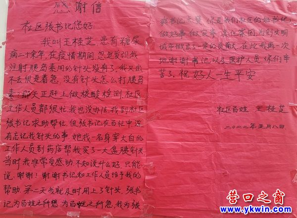 (營(yíng)口之窗社區(qū)訊)近日,新騰達(dá)社區(qū)收到了一封來(lái)自居民王女士發(fā)來(lái)的感謝信,字里行間透露了她內(nèi)心的感動(dòng)、感激和感受到的溫暖。