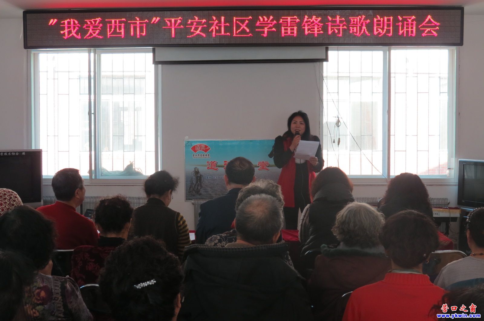 “學(xué)習(xí)雷鋒好榜樣,忠于革命忠于黨,愛(ài)憎分明不忘本,立場(chǎng)堅(jiān)定斗志強(qiáng)……”在平安社區(qū)二樓活動(dòng)室轄區(qū)居民們高聲唱響《學(xué)習(xí)雷鋒好榜樣》歌聲中,響應(yīng)新時(shí)代雷鋒精神的號(hào)召傳承新時(shí)代雷鋒精神,勝利街道平安社區(qū) “我愛(ài)西市”平安社區(qū)學(xué)雷鋒詩(shī)歌朗誦會(huì)拉開(kāi)了序幕。