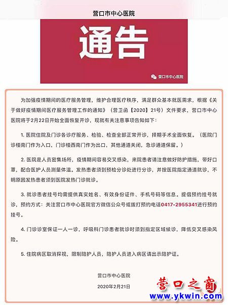 關于營口市中心醫(yī)院全面恢復開診的通告