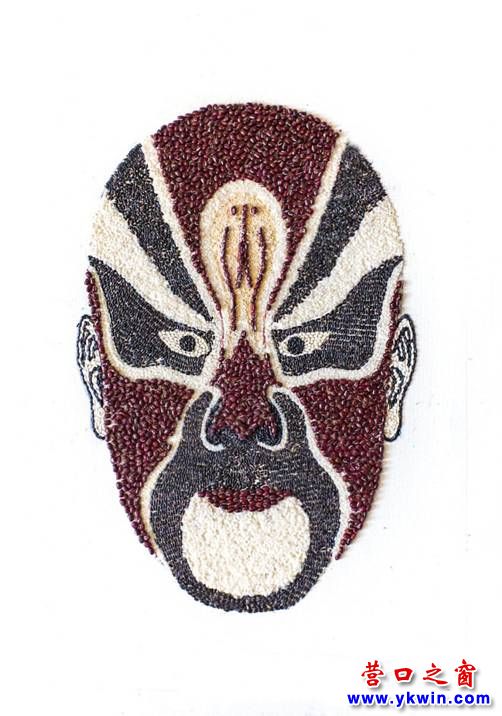 利用農(nóng)作物種子制作的京劇臉譜種子畫,活靈活現(xiàn),惟妙惟肖。
