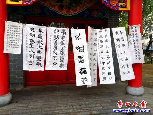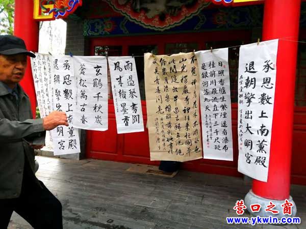 五月十七日是星期日,楹聯(lián)學會老年書法沙龍的詩友們在清晨就來到營口楞嚴寺的南門。早來的在地上寫地書,竟把清淡的水跡寫成了有滋有味的墨韻,引來游人的關注。待人到齊了他們就把事先寫好的作品掛了起來。這些作品有楹聯(lián),也有詩詞。有古作也有自創(chuàng)。書法既有中規(guī)中矩的楷書,也有龍飛鳳舞的行草。雖然比不上專業(yè)書法家的功底,但臨帖的韻味已經(jīng)初見端端倪。巧的是今天展示書法作品時,恰逢市書法協(xié)會苑慶民副主席路過此地。沙龍負責人誠請苑主席為大家點撥作品,苑主席認真觀察了作品,肯定了大家的努力,也指了作品的不足和努力的方向。