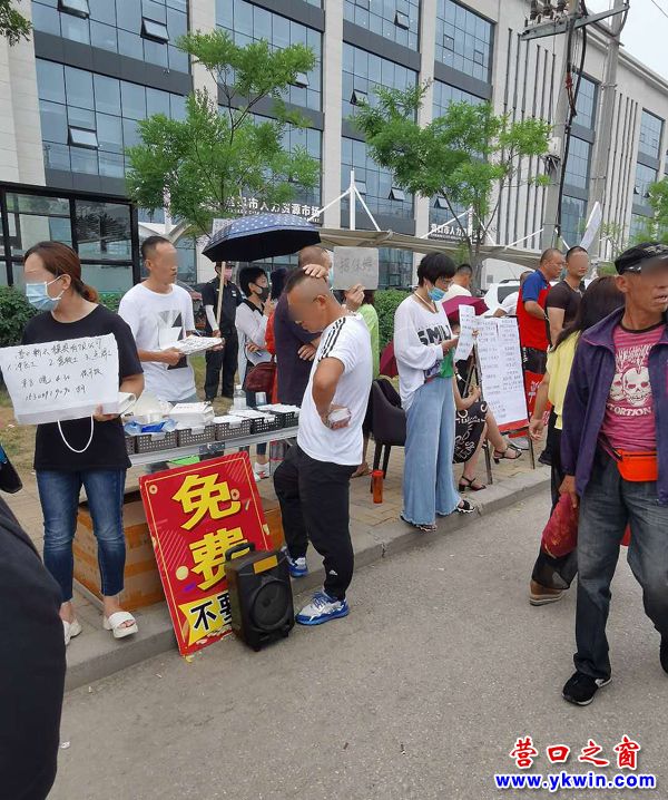 在營口市民服務(wù)中心北側(cè)門前,每到周二和周五人山人海,有商販賣貨的、有舉牌招攬業(yè)務(wù)的、有私自擺桌現(xiàn)場登記的、還有手機(jī)貼膜無線音箱呼喊的……,密集人群多數(shù)不戴口罩亂作一團(tuán)。