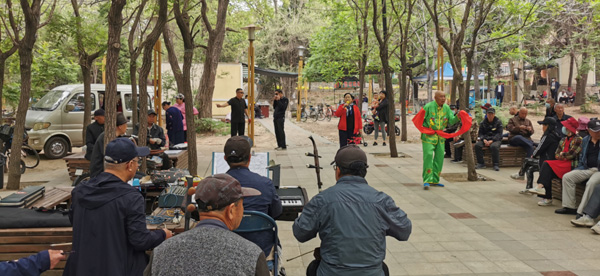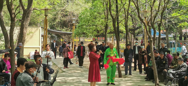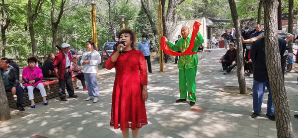 這里退休老人文化生活豐富多彩。天籟之音四溢,歌聲在樹林里蕩漾,樂隊(duì)與歌手默契配合,演奏出一首首悅耳動(dòng)聽的歌曲。游客賞美景聽音樂,享受著新時(shí)代物阜民豐,國泰民安的幸福生活。