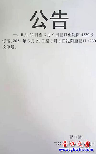 因受疫情影響,自2021年5月21日起至6月8日止,沈陽(yáng)開(kāi)往營(yíng)口的4230次列車(chē)停運(yùn);自5月22日起至6月9日止,營(yíng)口開(kāi)往沈陽(yáng)的4229次列車(chē)停運(yùn)。