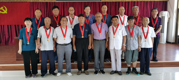 向在黨五十周年老黨員頒發(fā)紀(jì)念章。
