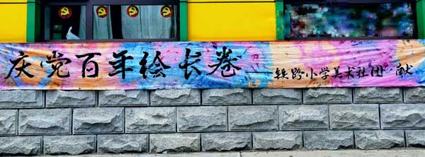 在舉國歡慶偉大的中國共產(chǎn)黨成立一百周年的日子里,鲅魚圈鐵路小學(xué)美術(shù)社團的小同學(xué)們集體繪制了一幅長卷《慶黨百年繪長卷》,于昨日掛在校外墻上,向家長及市民展出。向黨表達(dá)他們感恩黨、熱愛黨的一顆顆可愛的童心。