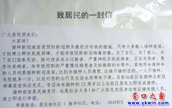 (營口之窗“百姓說事” )8月16日,在營口市站前區(qū)振華社區(qū)渤海明珠小區(qū)的居民樓門上見到了站前區(qū)新冠肺炎疫情防控指揮部《致居民的一封信》。