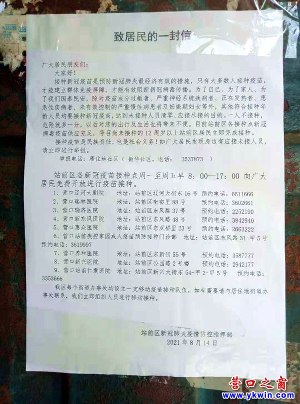 信中一并附上了站前區(qū)接種新冠疫苗的時間、地點和各接種點的預(yù)約電話。
