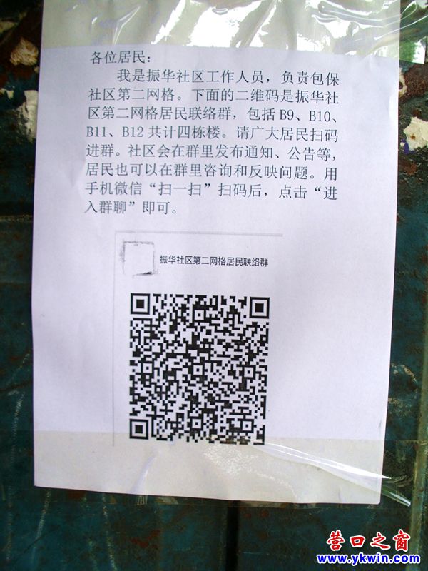 各位居民:我是振華社區(qū)的工作人員,負責(zé)包保社區(qū)第二網(wǎng)絡(luò),包括B9、B10、B11和B12共計四棟樓(近300戶居民)。請居民們用手機微信掃下面的二維碼進入本網(wǎng)絡(luò)居民聯(lián)絡(luò)群,我會在群里發(fā)布社區(qū)的通知、公告等,居民也可以在群里咨詢和反映問題。