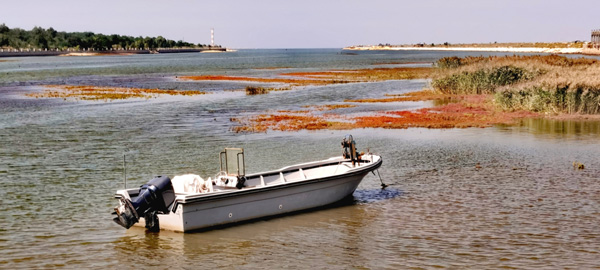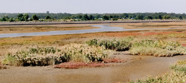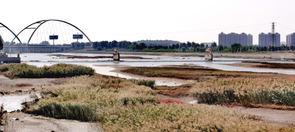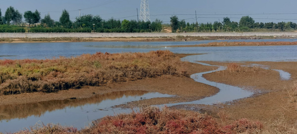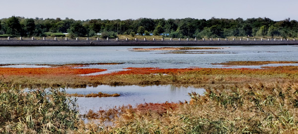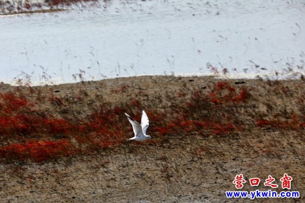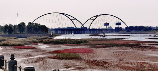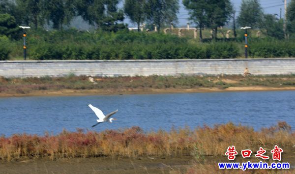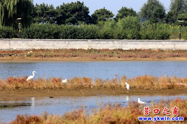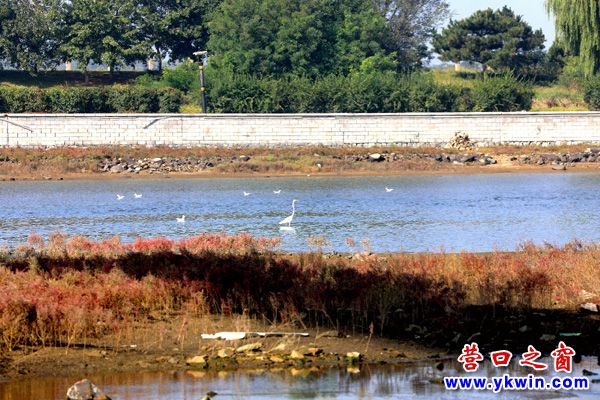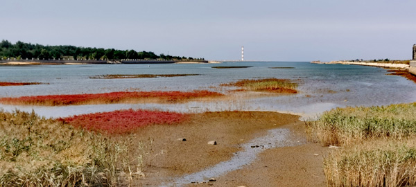 河海交匯處,由于潮汐的作用,海水和河水你來我往,我進(jìn)你退,就使這片灘涂生長了大片的蘆葦和堿蓬草。每年秋季來臨,堿蓬草越來越紅、蘆葦則黃綠相間、褐色的河床和閃著銀光的水流彎彎曲曲犬牙交錯、藍(lán)天白云下白色的水鳥追逐著水里的魚蝦……。一個別具特色的五彩灘就在我們的家門口。這就是營口市鲅魚圈區(qū)熊岳河的入???。