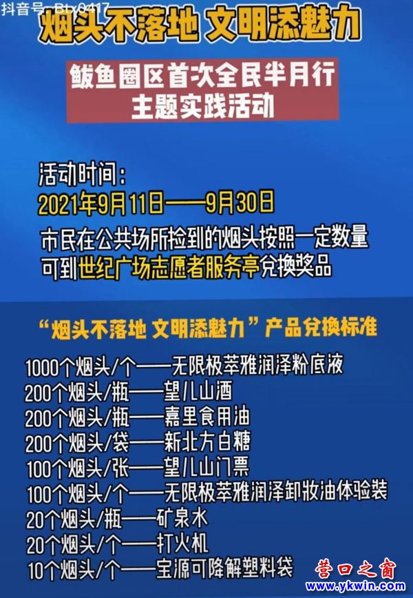 開展和提倡“煙頭不落地,文明添魅力”活動(dòng)。對(duì)于撿拾煙頭者,給予積極鼓勵(lì)和獎(jiǎng)勵(lì)。這是煙頭兌換獎(jiǎng)品處及兌換標(biāo)準(zhǔn)。