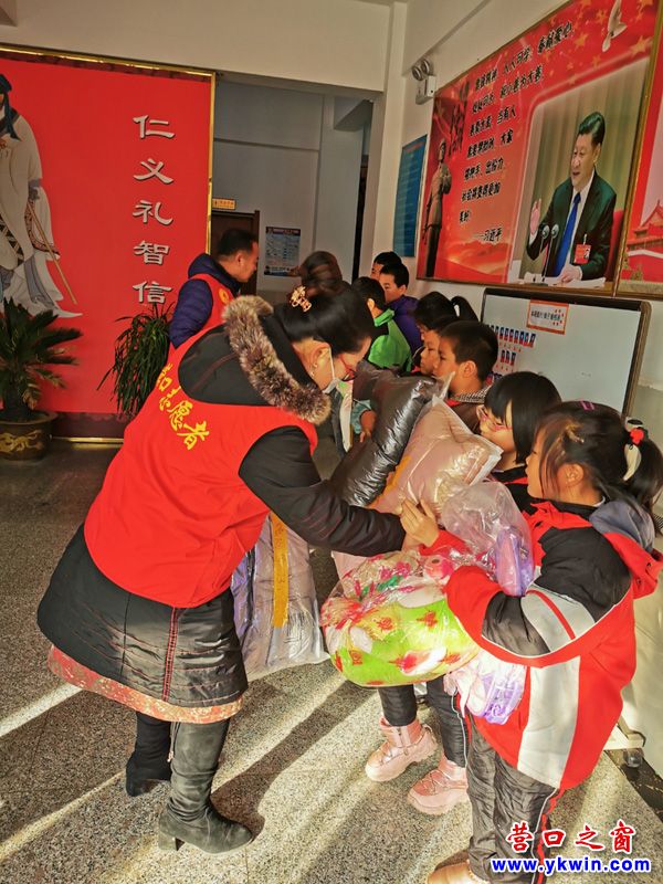 志愿者給被幫扶學(xué)生發(fā)棉服和學(xué)習(xí)用品