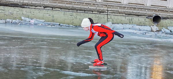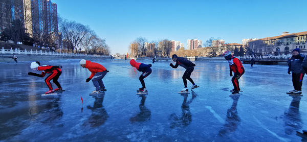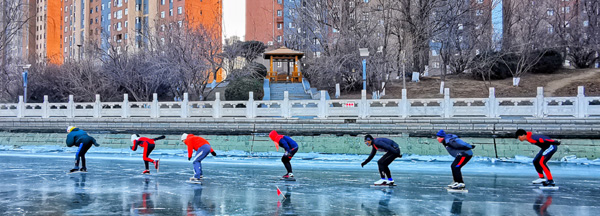 第三約滑冰:鲅魚圈滿族八旗冰嬉運(yùn)動(dòng)隊(duì),隊(duì)員相約紅海河滑冰訓(xùn)練。