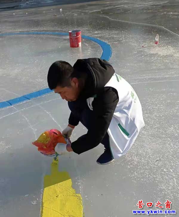 經(jīng)過精心測量,認(rèn)真構(gòu)圖,用斧頭、錛子、鋼釬在冰面上精雕細(xì)刻出五環(huán)圖?。掃凈殘冰,購買涂料,仔細(xì)涂描,于4:20分勝利完工。