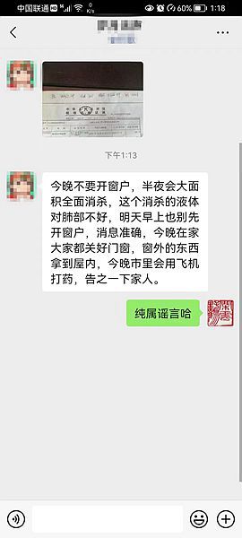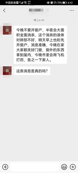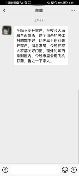 (營口之窗“百姓說事”)目前,很多營口人的朋友圈在傳播這樣一條消息:今晚不要開窗戶,半夜會大面積全面消殺,這個消殺的液體對肺部不好,明天早上也別先開窗戶,消息準確,今晚在家大家都關(guān)好門窗,窗外的東西拿到屋內(nèi),今晚市里會用飛機打藥,告之一下家人。