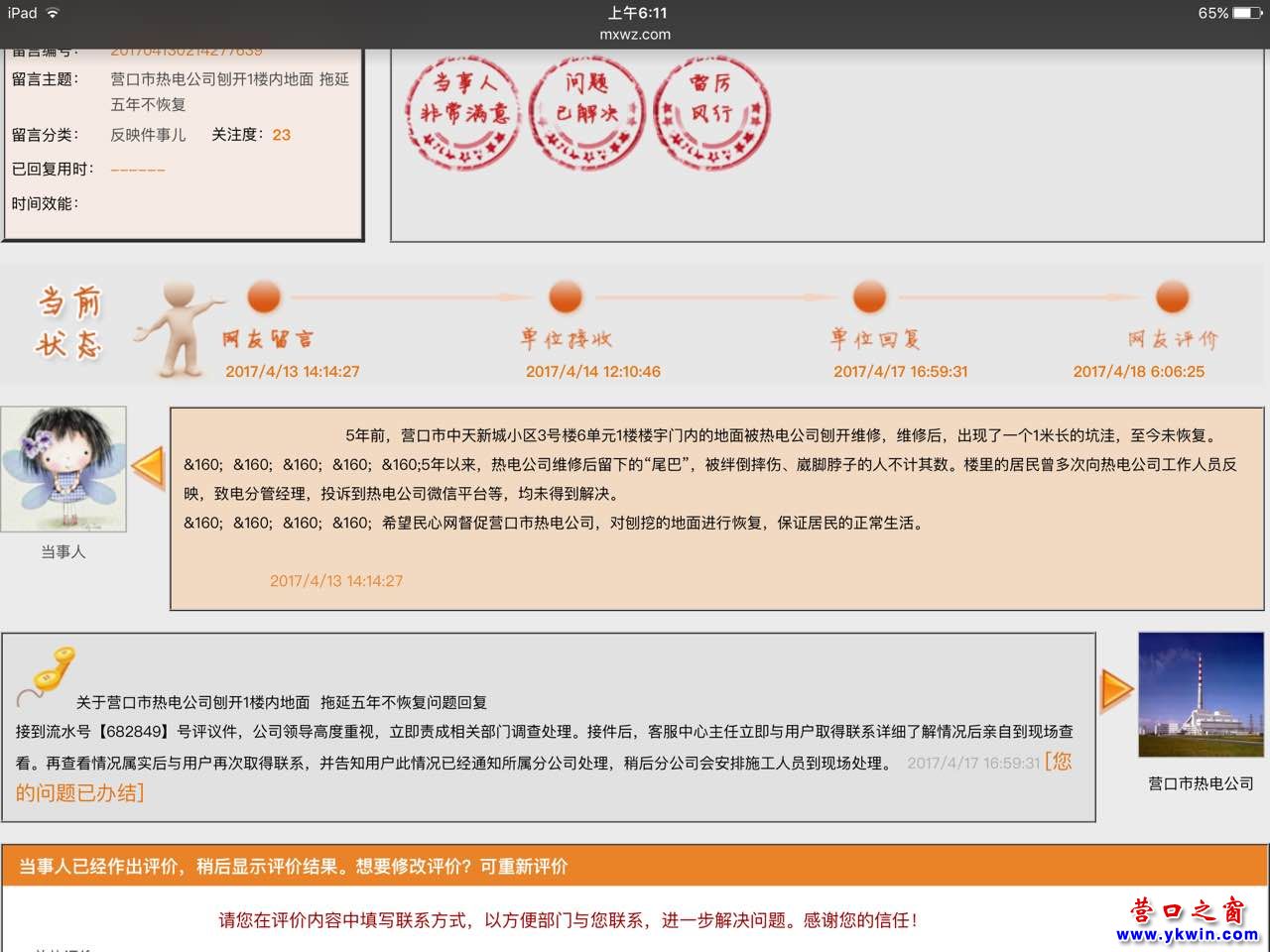 關于營口市熱電公司刨開中天新城小區(qū)3號樓6單元1樓內(nèi)地面維修,5年地面不恢復,在無數(shù)次向熱電公司反映無果的情況下,無奈,4月13日反映到民心網(wǎng),很快收到民心網(wǎng)回復,并告知反映的問題已辦結(jié)。