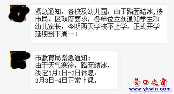 “緊急通知,各校及幼兒園,由于路面結(jié)冰,按市局,區(qū)政府要求,各單位立刻通知學(xué)生和幼兒家長(zhǎng),今明兩天學(xué)校不上學(xué),正式開學(xué)延期到下周一!”、“市教育局緊急通知: 由于天氣寒冷,路面結(jié)冰,決定3月1日-2日休息,3月3日-4日正常上課。”