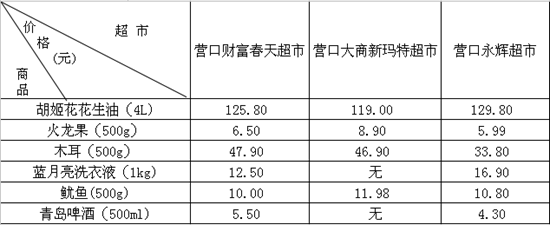 胡姬花花生油(4L),營口財富春天售價是125.8元,營口大商新瑪特超市售價119元,營口永輝超市售價129.8元;火龍果(500g),營口財富春天售價6.5元,營口大商新瑪特超市售價8.9元,營口永輝超市售價5.99元;秋木耳(500g),營口財富春天售價47.9元,營口大商新瑪特超市售價46.9元,營口永輝超市售價33.8元;藍月亮洗衣液(1kg),營口財富春天售價12.5元,營口永輝超市售價16.9元,魷魚(500g),營口財富春天售價10元,營口大商新瑪特超市售價11.98元,營口永輝超市售價10.80元;青島啤酒(500ml),營口財富春天售價是5.5元,營口永輝超市售價4.3元。