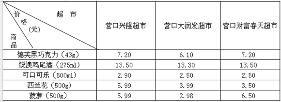 從表中對(duì)比可知:德芙黑巧克力(43g)為營(yíng)口興隆超市和財(cái)富春天超市賣價(jià)最高,銳澳雞尾酒(275ml)為營(yíng)口興隆超市和財(cái)富春天超市賣價(jià)最高;可口可樂(lè)(500ml)為營(yíng)口興隆超市賣價(jià)最高;西蘭花(500g)為營(yíng)口興隆超市賣價(jià)最高;菠蘿(500g)為營(yíng)口財(cái)富春天賣價(jià)最高。