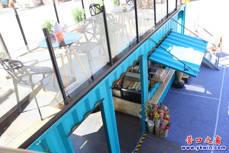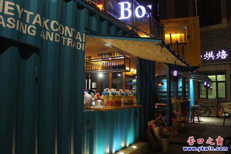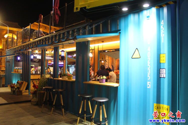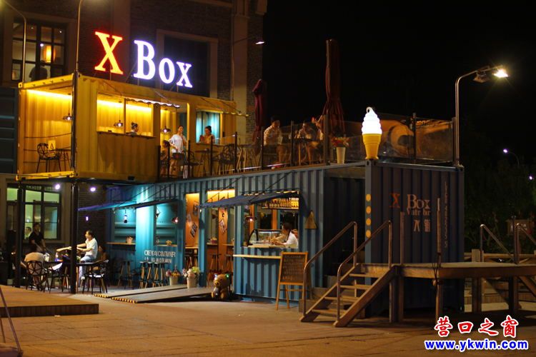 激浪藍、陽光黃,濃重的對立互補色粉飾著箱體——這是由兩個集裝箱上下錯位組合成的 X-Box水鋪。已經成為營口老街亮麗的風景線。如果你瞇起眼睛欣賞時,你就會想起美麗的沙灘、海浪…這是設計師應用對立互補色原理,讓各自的色彩都在視覺上加強了飽和度,顯得色相、純度更強烈,加之利用空間混合法,既緩和視覺刺激又產生悅目的搭配效果。只要你在老街駐足,此景定會讓你在視覺上為之一奪,這是記者看到 X-Box水鋪的第一印象。