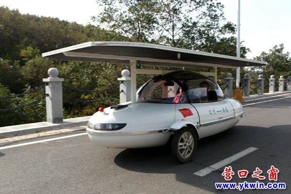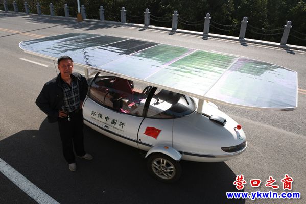 王永志駕駛太陽(yáng)能汽車載著妻子從赤山返程;
