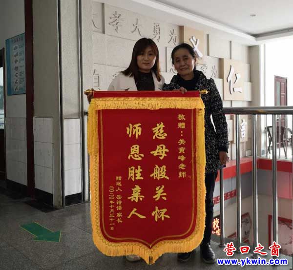 因工作原因,岳詩語同學的父母無法長期照顧其日常生活。岳詩語說:“平日里,關(guān)寅峰老師十分擔心我的身心健康。最近天氣寒冷,關(guān)老師看在眼里,急在心上。幾天前,關(guān)老師在百忙之中親自找到我,為我自費購買了一件棉襖。”為答謝關(guān)寅峰老師,2020年11月2日,岳詩語家長親自將一面錦旗送到了關(guān)寅峰老師的手中。
