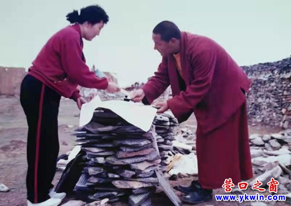 周老師(劉文遠妻)在喇嘛幫助下拓印石刻經(jīng)文。