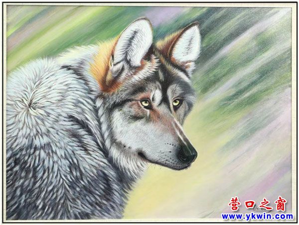 曉紅老師此次展出了兩幅《狼》作品,一幅是中國畫,另一副是油畫,兩幅都很棒,而后者是我更喜歡的。狼,在我們的印象中,是野性的,猙獰的,兇殘的,“狼子野心”、“如狼似虎”、“財狼當?shù)?rdquo;、“狼狽為奸”…好像就沒有幾個好詞來形容的。其實,狼的團隊精神,知恩圖報的個案,在國外小說《遠方的呼喚》和姜戎的《狼圖騰》中,亦有介紹。當我仔細欣賞這幅油畫《狼》時,固有的觀念,頃刻之間被顛覆了!這幅寫實的油畫,精細到像是一幅高清的彩色照片,凝視遠方深邃的目光,是犀利是警覺,前傾豎起的耳朵,是在聽同伴的呼喚?微張的鼻孔,是在嗅聞獵物的氣息?灰黑棕的毛羽,每一條都細膩清晰獨立存在,又分布和諧混然一體,在寫意的背景襯托中,毛羽視乎在隨風(fēng)而動??蓯鄣囊粭l狼,仿若是一條溫順的哈士奇!此刻,令人聯(lián)想到的是,我們居住的這個星球,本來就是多物種共同的一個大家園,何必喊打喊殺,若唯有人類獨存,或許,即是一種災(zāi)難!由此,我頓覺曉紅老師的油畫《狼》,栩栩如生,惟妙惟肖,溫順平和,或許,這幅作品,即是一次藝術(shù)升華的表達,抑或也是在傳達慈愛包容的一種方法?我想,應(yīng)該是二者兼而有之吧!