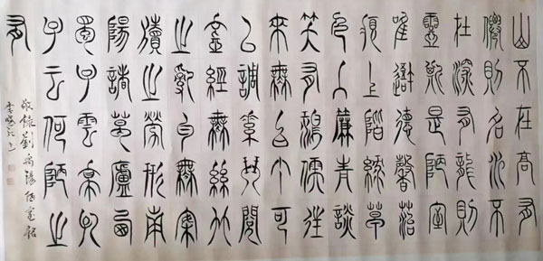 篆書之妙,猶如龍蛇之舞動,蘊含著深沉的歷史文化和豐富的思想內(nèi)涵,讓人沉醉其中。采用柳葉篆書體創(chuàng)作的《陋室銘》,絕對是上乘佳作,仿若是晉衛(wèi)瓘的嫡系真?zhèn)鳎?/p>