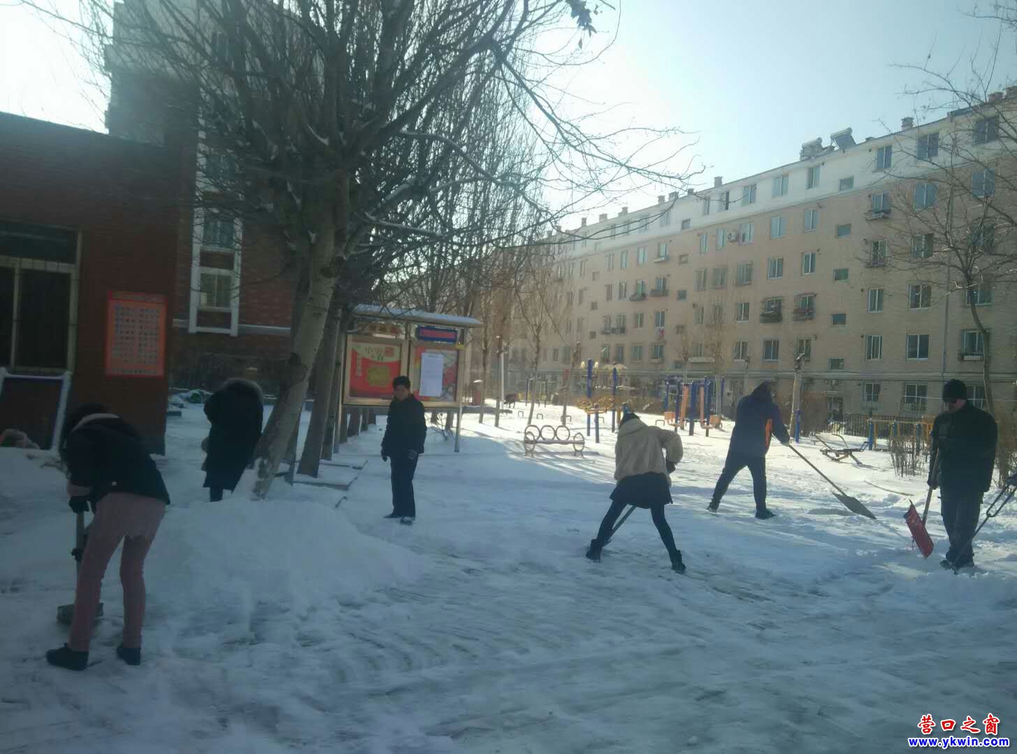 大家拿起掃把、鐵鍬將社區(qū)小廣場(chǎng)的積雪清理干凈,天氣雖然寒冷,但社區(qū)干部們干勁十足,連鏟帶掃,不一會(huì)兒的工夫,社區(qū)前的小廣場(chǎng)的積雪就被掃的干干凈凈。隨后大家又開(kāi)始清理社區(qū)旁邊路段的積雪。由于寒流影響,道路背陰處積雪融化后變成冰面,給清掃工作帶來(lái)極大不便。大家鏟的鏟、掃的掃,干得熱火朝天。經(jīng)過(guò)1個(gè)多小時(shí)的奮戰(zhàn),社區(qū)內(nèi)的各條主干道已被清掃干凈,小區(qū)內(nèi)外道路暢通無(wú)阻,確保居民安全出行,這一舉動(dòng)受到居民稱贊.