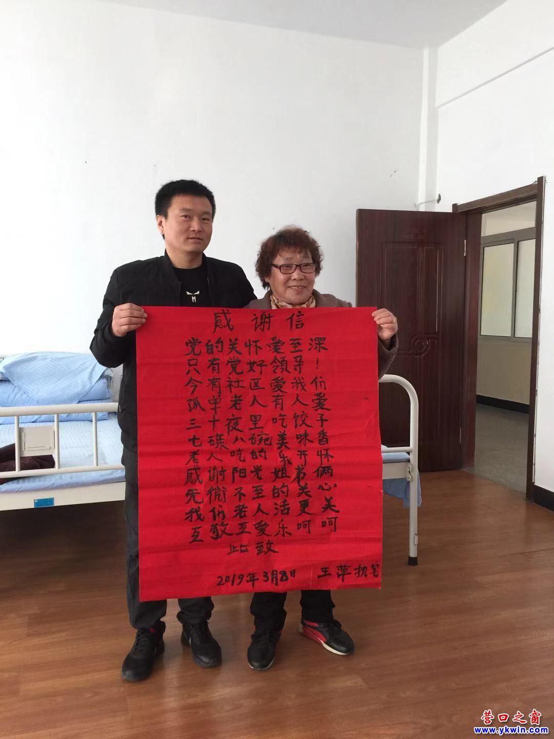 這位特殊的居民便是新騰達社區(qū)孤寡老人王萍,王萍鄉(xiāng)進城,喪偶,無父母,無子女,無退休金。為了讓轄區(qū)里像王萍這樣的孤寡老人、空巢老人能過上一個溫馨祥和的春節(jié),在除夕當天新騰達社區(qū)工作者及營口市陽光社會工作發(fā)展中心的志愿者們?yōu)樗麄儨蕚淞嗣牢犊煽诘哪暌癸?,老人們都深受感動。為了表示感謝,王萍阿姨在三八婦女節(jié)當天親自送來了感謝信,內容真摯感人,真真正正把社區(qū)工作者當做自己的家人,把社區(qū)當成自己的家,一封飽含溫暖的感謝信是社區(qū)工作者收到最好的節(jié)日禮物。