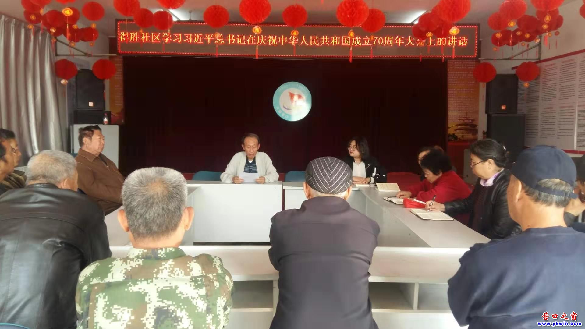 為了熱烈慶祝中華人民共和國(guó)成立70周年,10月12日上午,得勝社區(qū)組織轄區(qū)黨員學(xué)習(xí)貫徹習(xí)近平總書(shū)記在慶祝中華人民共和國(guó)成立70周年大會(huì)上的講話(huà)。
