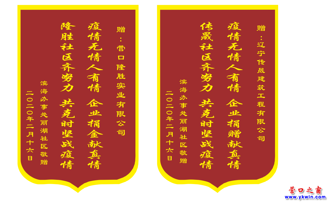 “疫情無情人有情, 企業(yè)捐金獻(xiàn)真情”,“隆勝傳晟齊努力 共克時(shí)堅(jiān)戰(zhàn)疫情”。兩面小小的錦旗被送到遼寧傳晟建筑工程有限公司和營口隆勝實(shí)業(yè)有限公司負(fù)責(zé)人手中。這小小的錦旗代表了麗湖社區(qū)沉甸甸的心意和做好防疫工作的堅(jiān)定承諾。