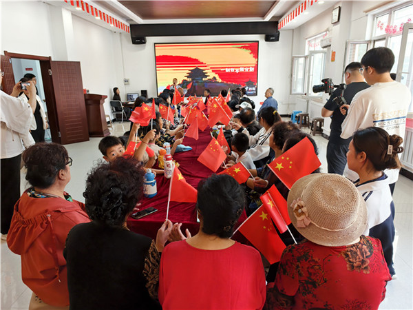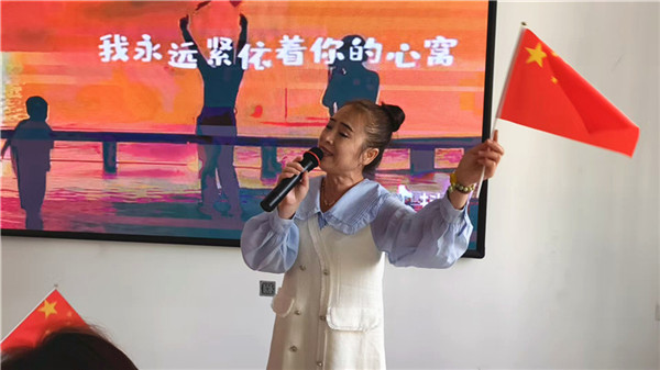 社區(qū)工作者帶領(lǐng)大家齊唱《我和我的祖國》。嘹亮的歌聲傳遞對祖國的熱愛,紅色的情感在人群中交融。