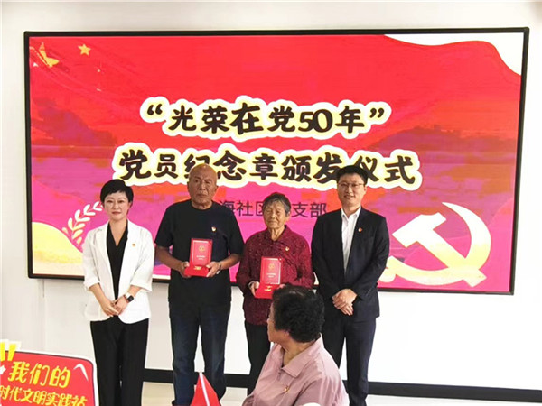 社區(qū)書記為黨齡滿50年的老黨員頒發(fā)紀(jì)念黨章。這些老黨員用半個世紀(jì)的堅守,詮釋了共產(chǎn)黨員的初心與擔(dān)當(dāng),他們的故事是社區(qū)最珍貴的財富。